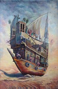از سوی دیگر فیگورهای انسانی در حال کار، تلاش و مشارکت همگانی حکایت شکل گیری یک تمدن مدرن در دل کویر را شکل داده است. اسب سفید بر عرشه، فرهنگ بادیهنشینی، روایت ماندگاری بنیانهای اصیل عربی در عصر مدرنیته را نشان میدهد. این لایهها، اثر را به جریان مانای زندگی تبدیل کرده که ریشههای عربی را گرامی داشته و دستاوردهای مدرن را جشن میگیرد.