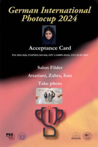 یک قطعه از آثار عکاسی کوچک ترین عضو گروه عکس آرتونیست تهران مورد پذیرش گروه داوری بیست و پنجمین دوره مسابقه و نمایشگاه بین المللی عکاسی German International Photocup 2024 در کشور آلمان قرار گرفت . به گزارش واحد خبر روابط عمومی و بین الملل موسسه فرهنگی ، هنری و رسانه ای آرتونیست ، در این مسابقه سالانه که در چهار بخش رنگی ، تک رنگ ، طبیعت ، بازی و سرگرمی برگزار می شود ، زهرا عطاریانی هنرآموز نخبه ایرانی به عنوان تنها نماینده جمهوری اسلامی ایران با یک عکس در بخش رنگی و با عنوان ” عکس بگیر ” در این نمایشگاه حضوری چند باره و موفق را تجربه کرد .