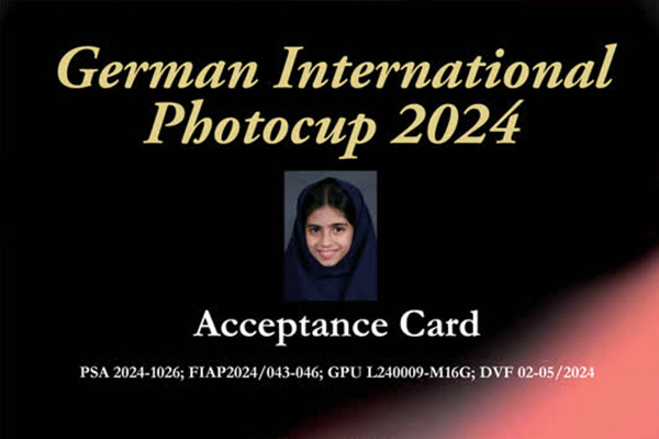شایان ذکر است که این موفقیت ، هشتمین حضور این دانش آموز هنرمند ایرانی در مسابقه های جهانی عکاسی می باشد . برگزاری این رقابت بین المللی برای بیست و پنجمین سال متوالی ، توسط معتبرترین مراجع عکاسی جهان از جمله ، فدراسیون عکاسی آلمان DVF ، موسسه عکاسی D.pixx foto ، اتحادیه جهانی عکاسی GPU با نظارت انجمن عکاسی آمریکا PSA و تحت امتیاز رسمی فدراسیون جهانی عکاسی FIAP انجام می گردد . علاقه مندان محترم می توانند جهت کسب اطلاعات بیشتر و مشاهده عکس های منتخب به پایگاه اطلاع رسانی مسابقه به نشانی www.germanphotocup.de مراجعه نمایند.