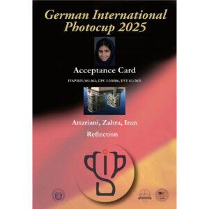 یک قطعه از آثار هنری کوچک ترین عضو گروه عکس آرتونیست تهران مورد پذیرش گروه داوری بیست و ششمین دوره مسابقه و نمایشگاه بین المللی عکاسی German International Photocup در سال 2025 در کشور آلمان قرار گرفت .